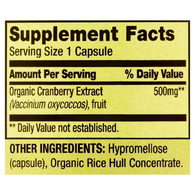 As cápsulas vegetarianas de extrato de cranberry Spring Valley são suplementos dietéticos que promovem a saúde do trato urinário e podem promover atividade antioxidante.* Cada cápsula vegetal contém 500 miligramas de extrato de cranberry orgânico. A dosagem sugerida para adultos é de uma cápsula ao dia, de preferência com as refeições. Essas cápsulas não contêm glúten, fermento, trigo, leite ou derivados de leite, lactose, açúcar, soja e cores e sabores artificiais. Eles contêm menos de 5 miligramas de sódio por cápsula. Você pode ter certeza de que as cápsulas vegetarianas de extrato de cranberry Spring Valley são produzidas com rígidas diretrizes de qualidade e contam com o respaldo de nossa garantia de qualidade. Assuma o controle da saúde do seu trato urinário com as cápsulas vegetarianas de extrato de cranberry Spring Valley.