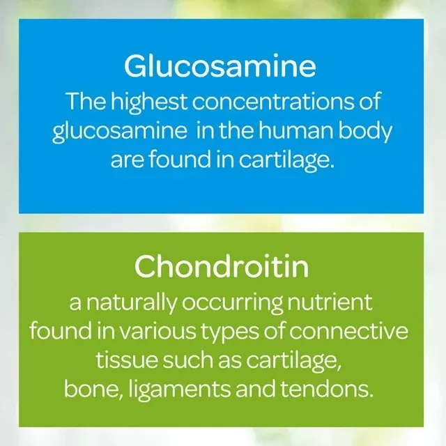 A glucosamina e a condroitina fazem parte da complexa matriz do tecido conjuntivo que é responsável pelo amortecimento de articulações e ossos, trabalhando em conjunto para apoiar a estrutura das articulações.