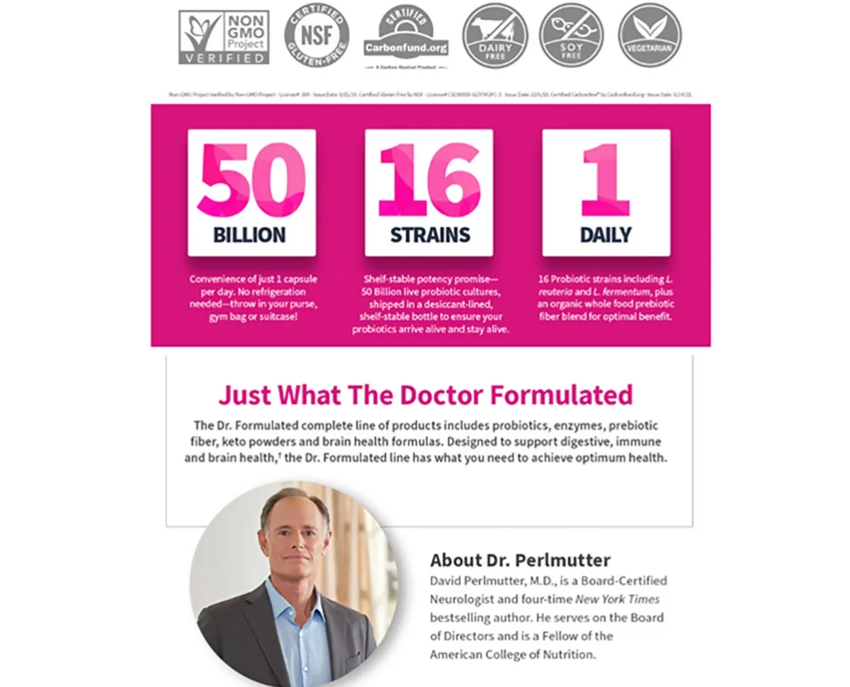 As mulheres têm necessidades únicas e nós temos uma fórmula especializada só para você. Nosso médico formulou probióticos uma vez ao dia para mulheres, orgulhosamente formulados pelo Dr. David Perlmutter, MD para um sistema digestivo, imunológico e saúde vaginal ideais. Em apenas uma cápsula diária, incluímos 50 bilhões de UFC de 16 cepas probióticas diversas, incluindo L. Reuteri e L. Fermentum, cepas clinicamente estudadas que demonstraram apoiar a saúde das mulheres. Há também uma mistura integral de fibras prebióticas para promover o crescimento de bactérias boas para obter o benefício ideal. Os adultos tomam 1 cápsula por dia. Pode ser tomado com ou sem alimentos. As cápsulas podem ser abertas e o conteúdo tomado diretamente com água ou suco. Não destinado a crianças. Estas declarações não foram avaliadas pela Food and Drug Administration. Este produto não se destina a diagnosticar, tratar, curar ou prevenir qualquer doença.