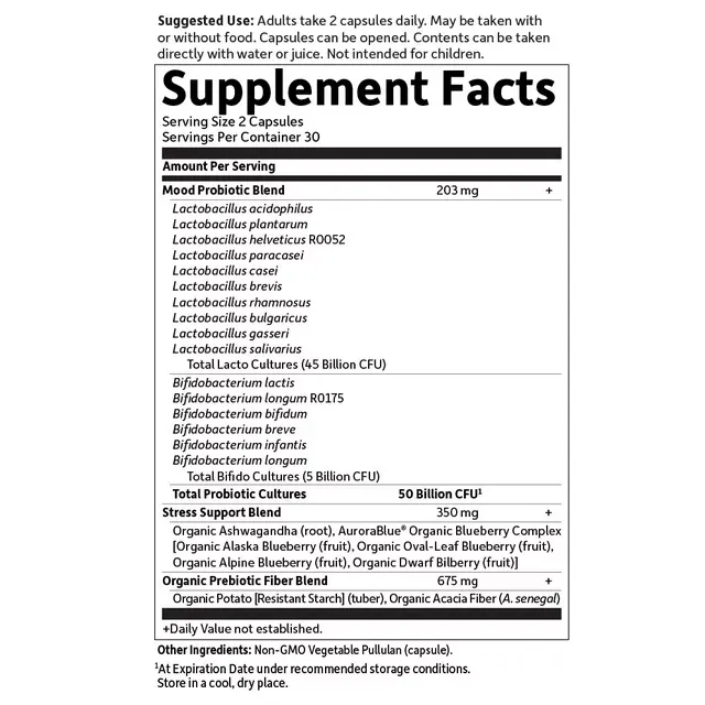 Promove bem-estar emocional e relaxamento; Apoia o equilíbrio digestivo; 50 bilhões de UFC1; 16 cepas probióticas; Contém L. helveticus R0052 e B. longum R0175 clinicamente estudados para bem-estar emocional; Contém 350mg de ashwagandha orgânica e mirtilos orgânicos do Alasca para controle do estresse; Contém Fibra Prebiótica de Acácia; Feito com mais de 70% de ingredientes orgânicos - certificados pela QCS
