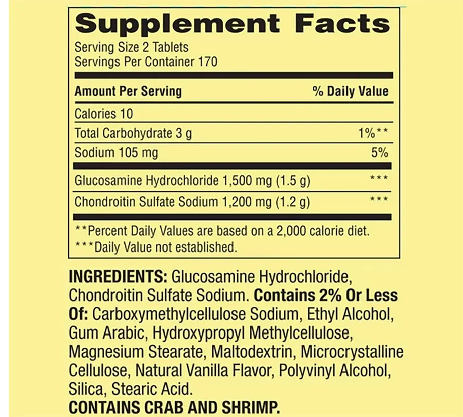 Ingredientes inativos: Cloridrato de condroitina sulfato de sódio glucosamina Contém 2% ou menos de: Carboximetilcelulose de sódio, Hidroxipropilmetilcelulose, Estearato de magnésio, Celulose microcristalina, Sabor natural de baunilha, Álcool polivinil, Dióxido de silício, Ácido Esteárico